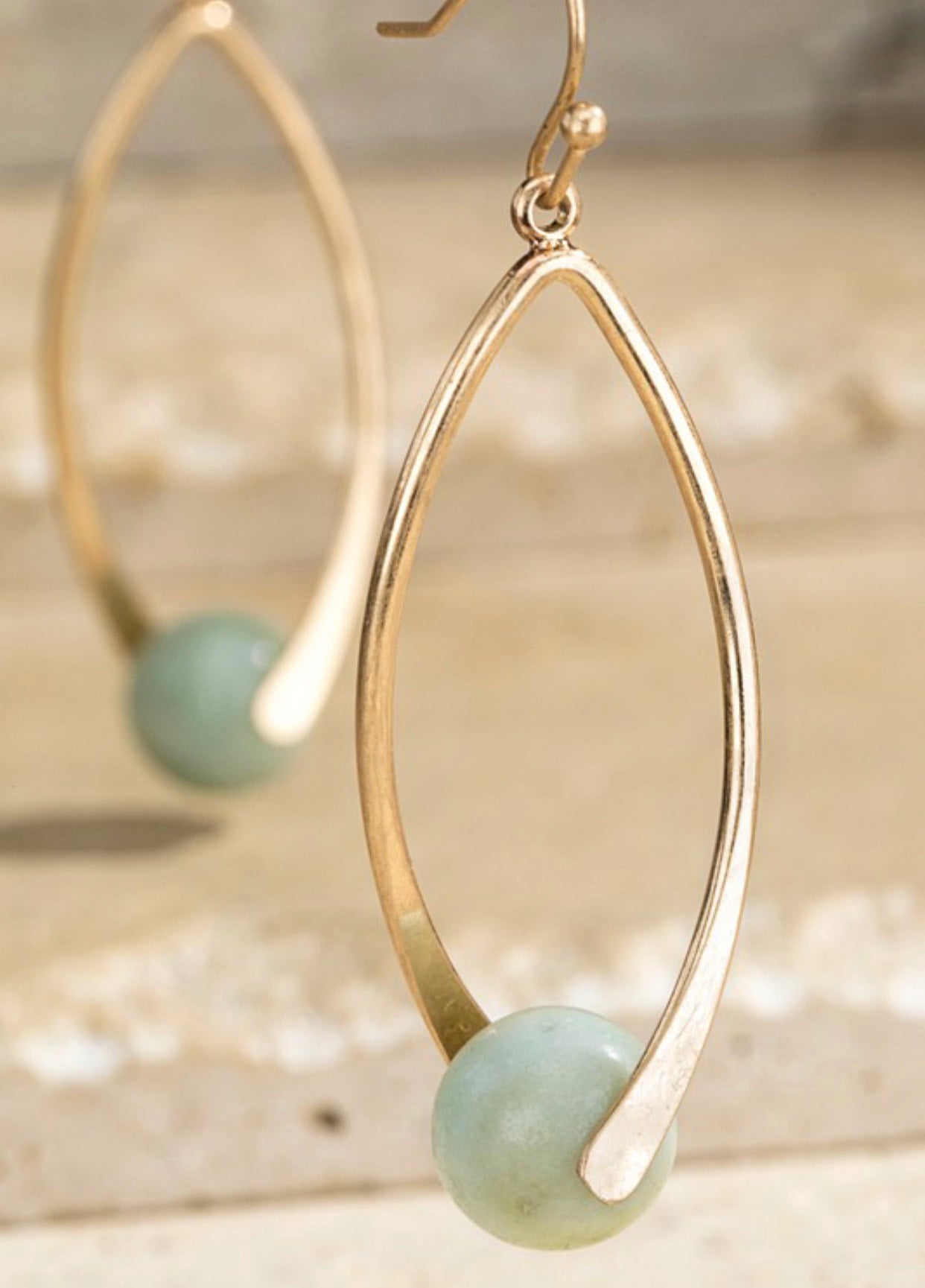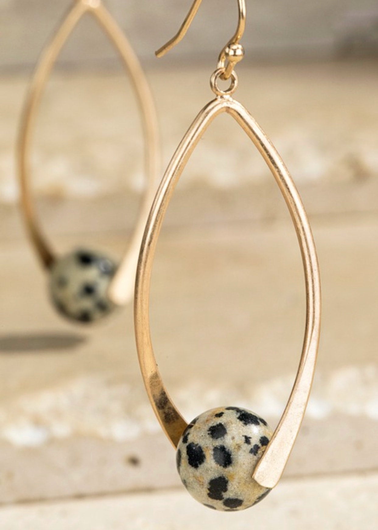 Charming round natural stone bead with a satin metal tear drop dangle fish hook earrings *APPROX. L 2" W 0.75" *Lead Compliant. Colors: Dalmatian & Amazonite.