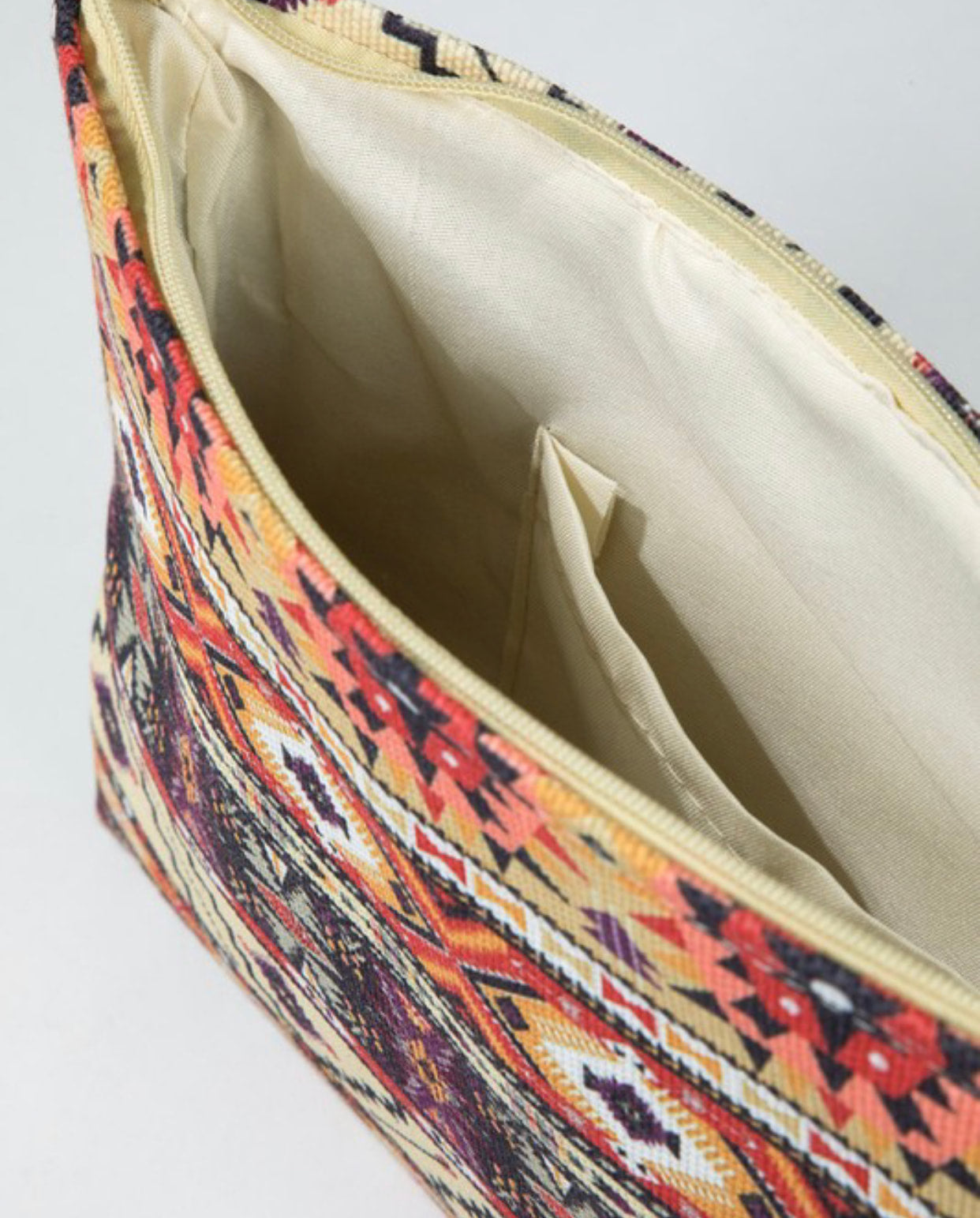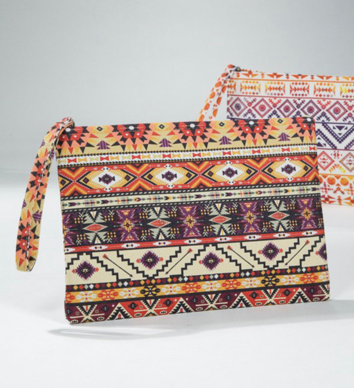 Ethnic rich color print with wristlet zipper pouch *60% Cotton 40% Polyester *APPROX. L 10" W 7" *Imported. Color: Rust.