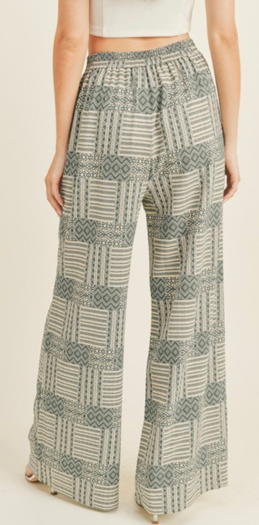 Wide Leg Pants.  Printed woven fabrication.  Side pockets