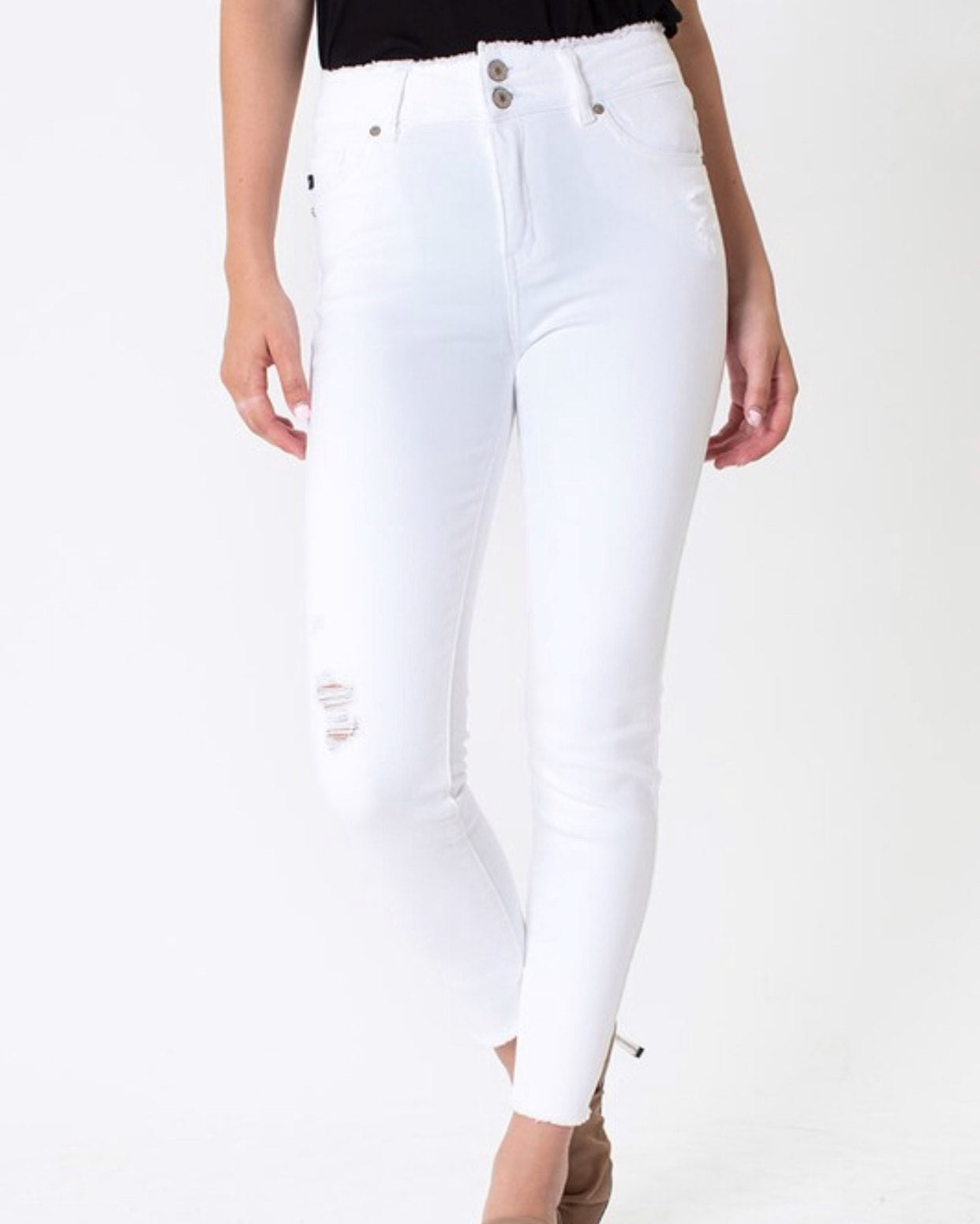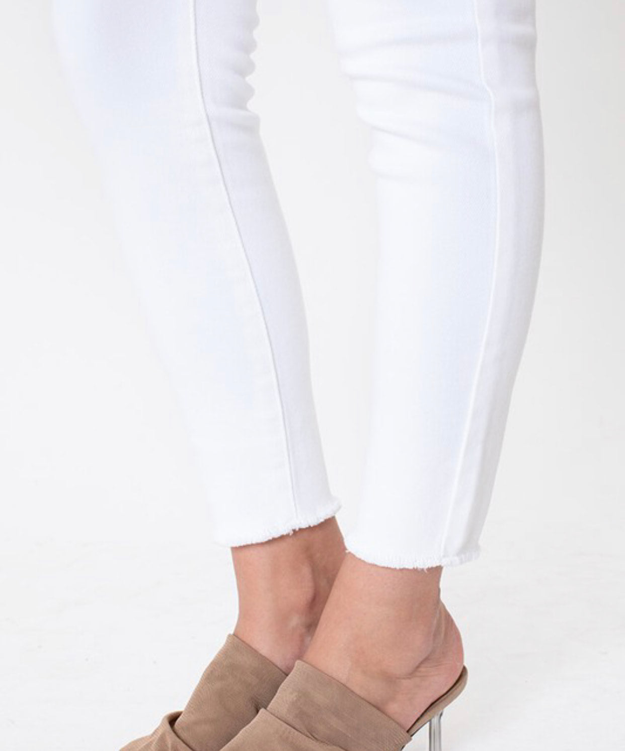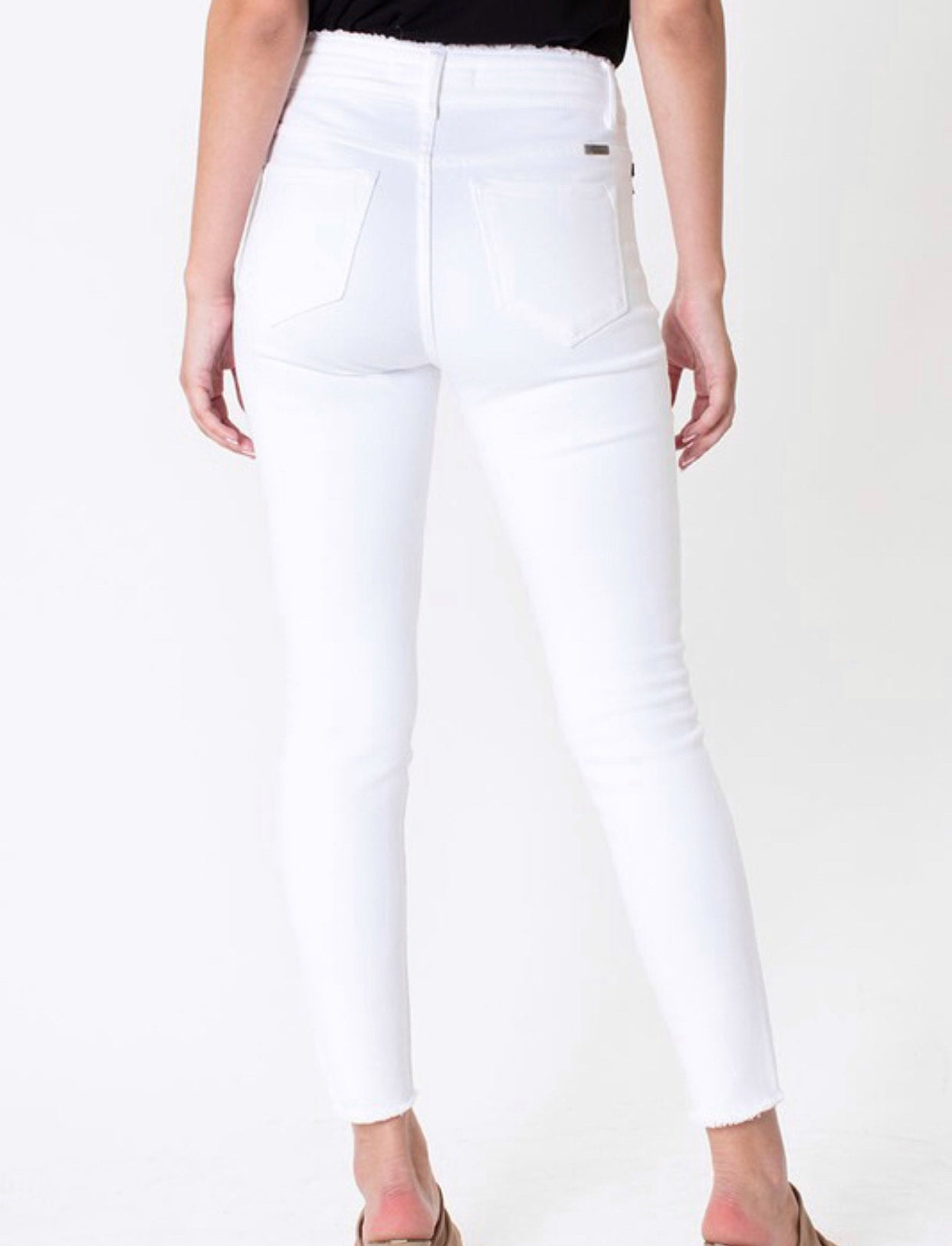Our Kan Can USA Mae Jeans are ultra high-rise white skinny jeans. Fabric: 94.8% Cotton, 4% Polyester, and 1.2% Spandex. Color: White.