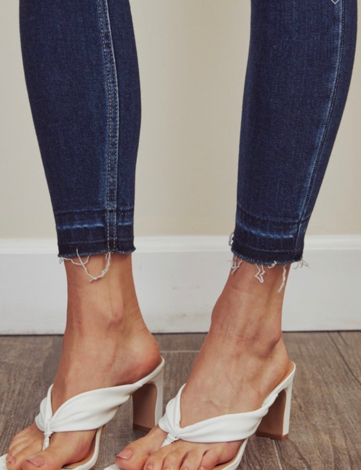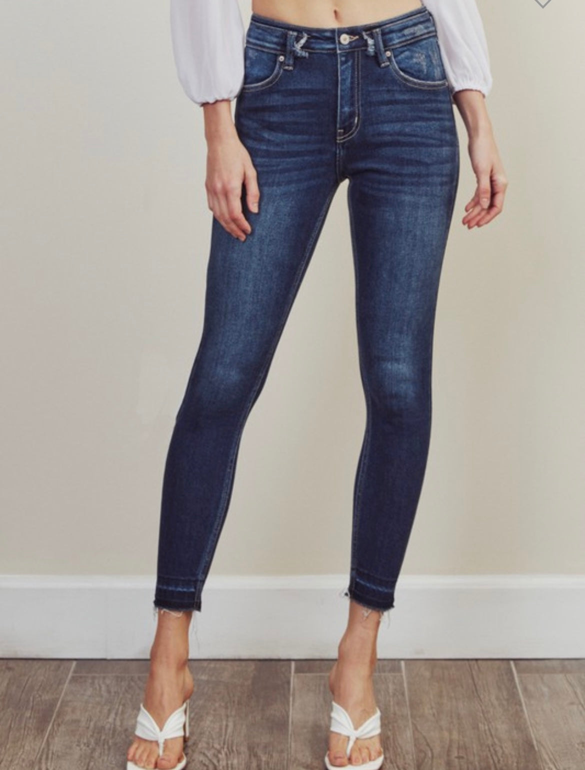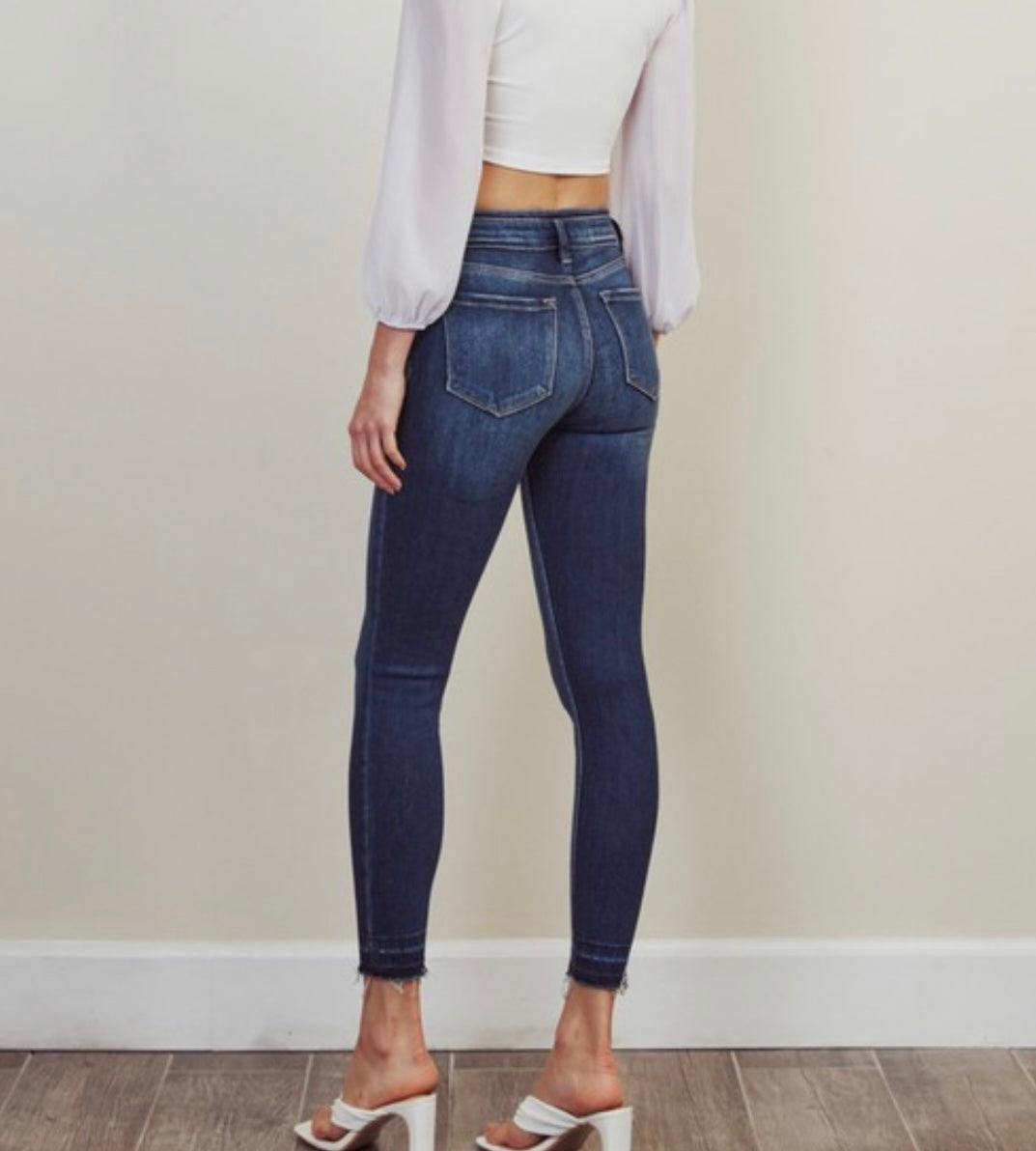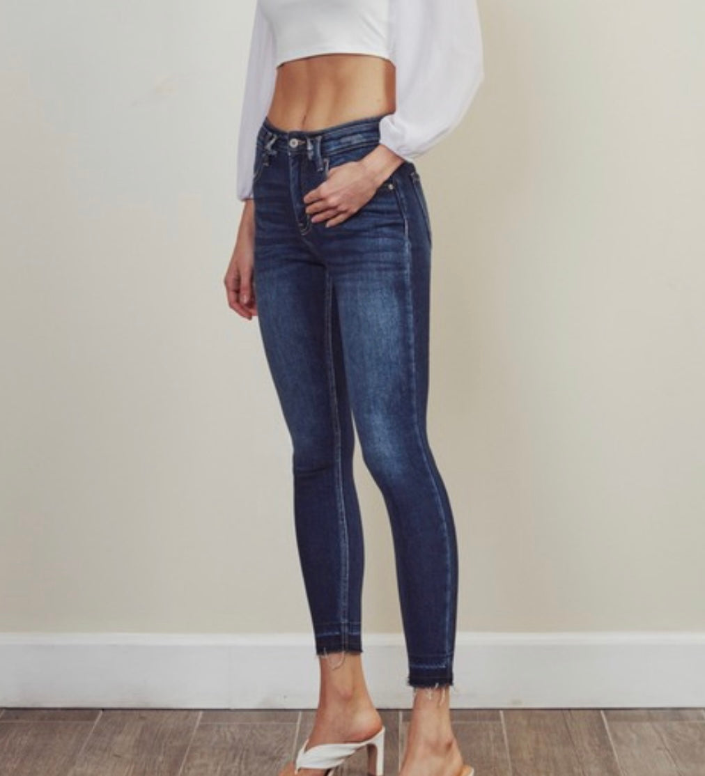 High rise double waist band. Ankle skinny. Zip fly.