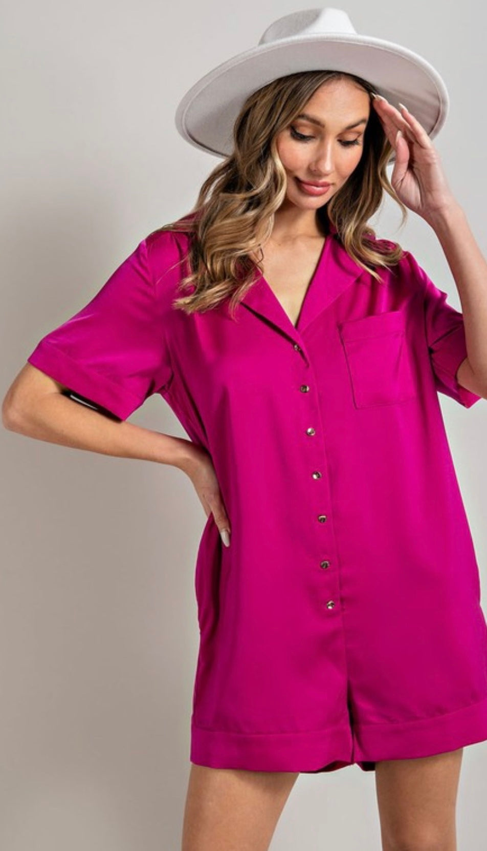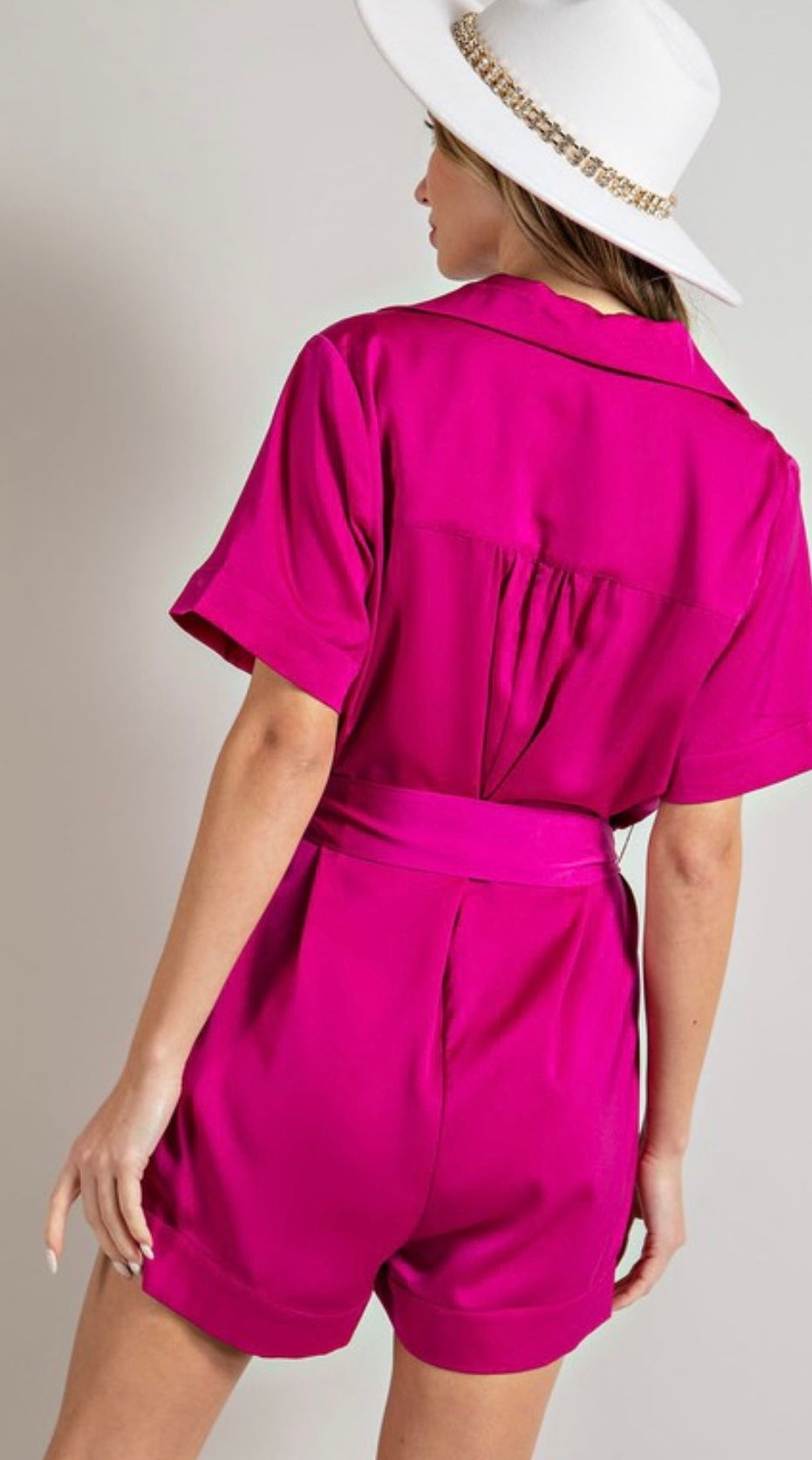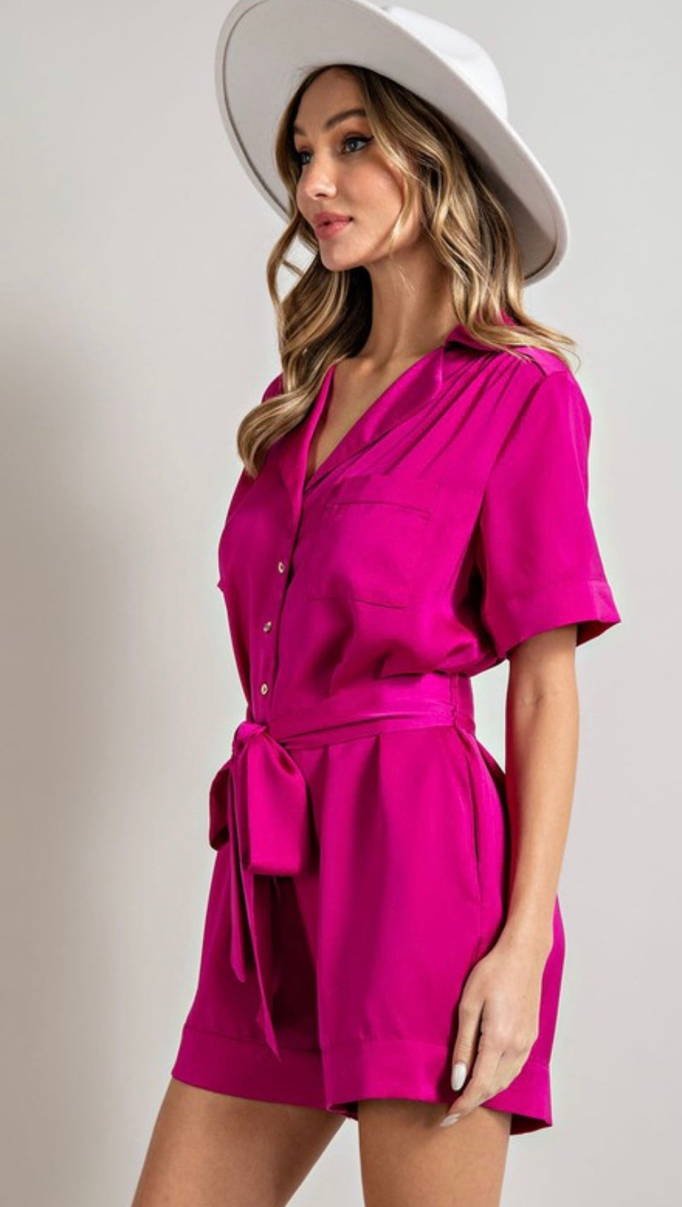 Button down short sleeve romper with an optional waist tie and two side pockets.