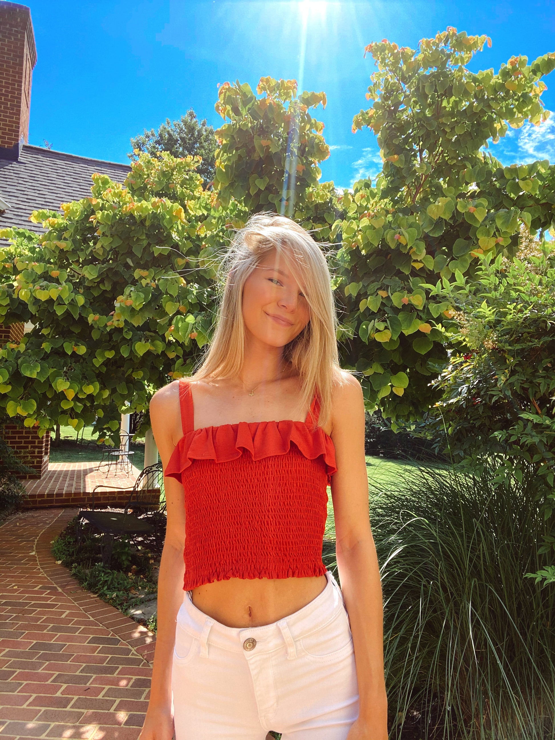 Smocked Ruffle Crop Top The cutest ruffle crop top! Square neckline with ruffle detail, cropped length made with a soft knit fabric for fitted look. Made in the USA! Color: LT Rust. Sizes: S, M, L.